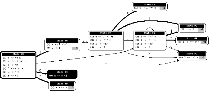 "I made a program to generate dot files representing the LR(0) state graph along with computed LALR(1) lookahead for an arbitrary context-free grammar, to make the diagrams I used in this article: http://blog.lab49.com/archives/2471. The program also highlights errant nodes in red if the grammar would produce a shift/reduce or reduce/reduce conflict -- you may be able to go to http://kthielen.dnsalias.com:8082/ to produce a graph more to your liking". Contributed by Kalani Thielen.